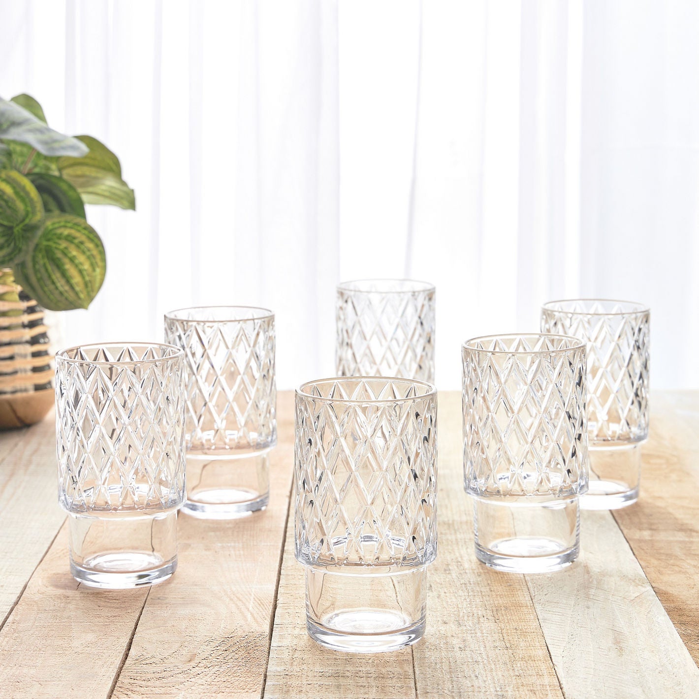 Render a modern appeal to your dining table collection with this set of six highball glasses. The basic cylindrical make is fuss-free and the unique textured pattern will look great on all occasions.