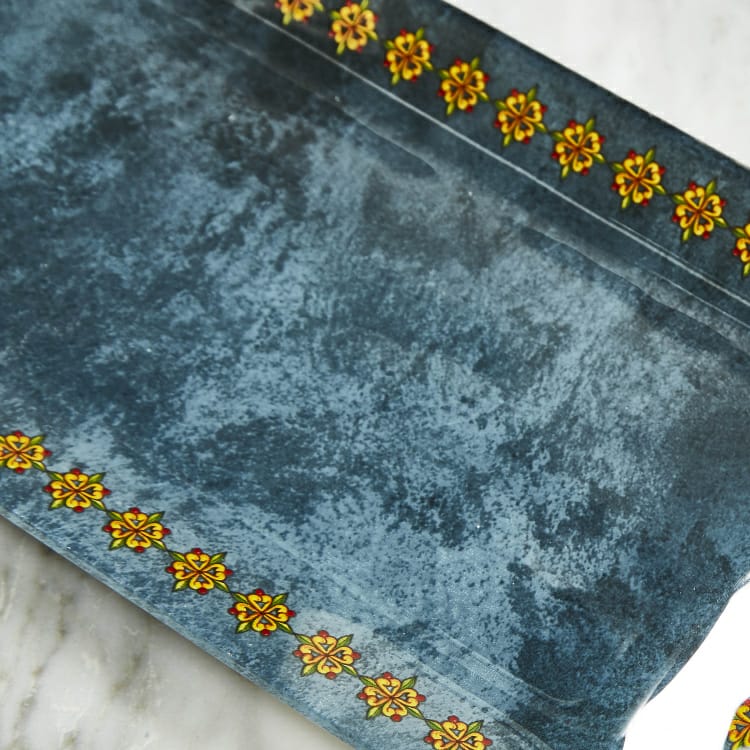 Made of glass and tinted in an enticing shade, this rectangular tray will be a gorgeous pick to serve a range of appetisers or finger foods. Adorned with traditional floral motifs along the border, the tray will be a tasteful addition to your serveware collection.