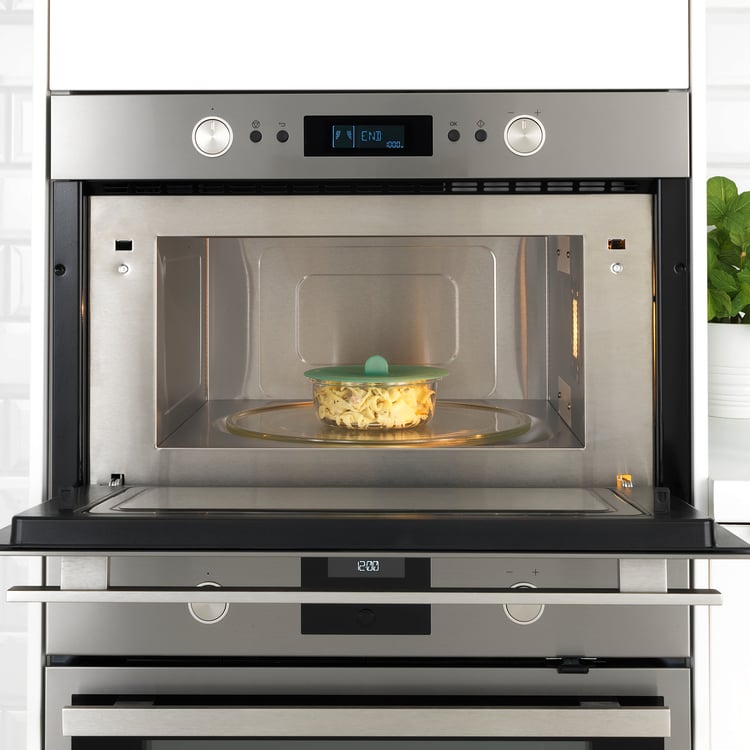 A double-duty lid! Pressing it onto a round food container in the IKEA 365+ series creates a vacuum that keeps your food fresh for longer – and in the microwave and oven it acts as a splatter guard.