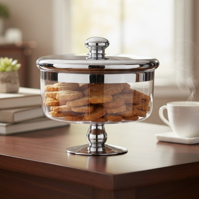 Elevate your décor with this sophisticated footed glass jar, crafted from premium glass with an elegant golden cap. The pedestal base adds a refined touch to any shelf, mantelpiece, or tabletop display. Perfect for storing decorative items, potpourri, or layered botanicals while maintaining a polished aesthetic. Its timeless design complements both contemporary and traditional interiors, making it an essential accent piece for discerning collectors and design enthusiasts.